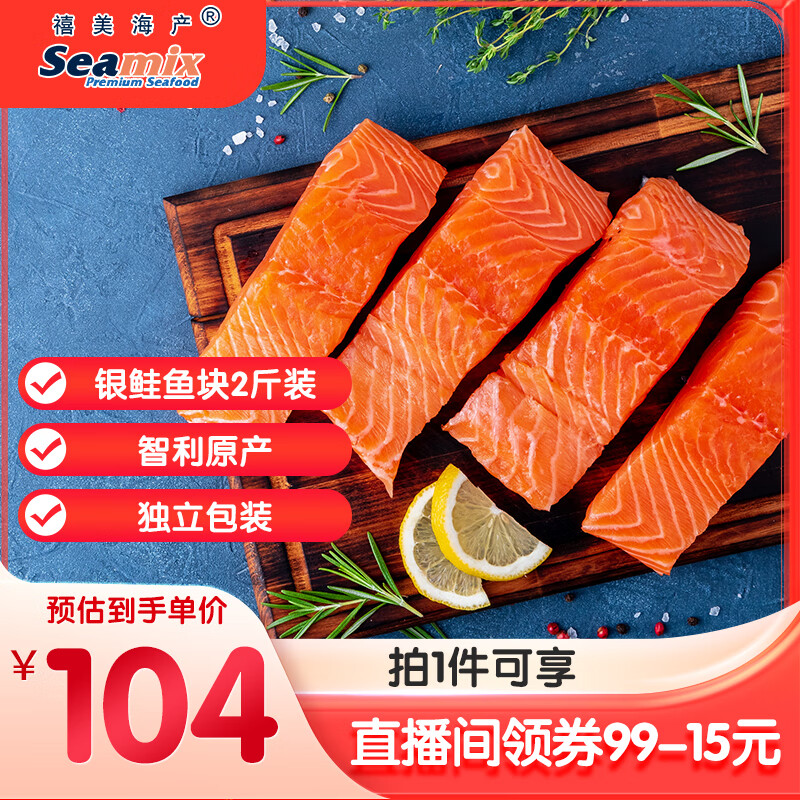 包邮 禧美海产 冷冻智利三文鱼块净重2斤(银鲑) 独立4-7块 带皮去刺 海鲜